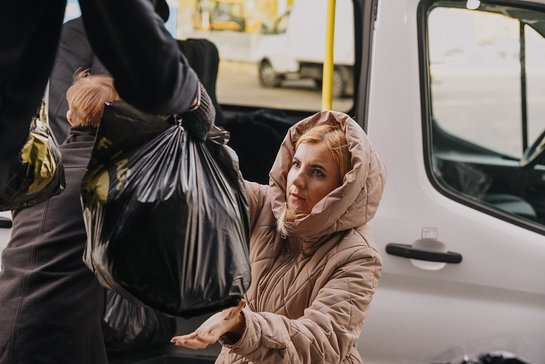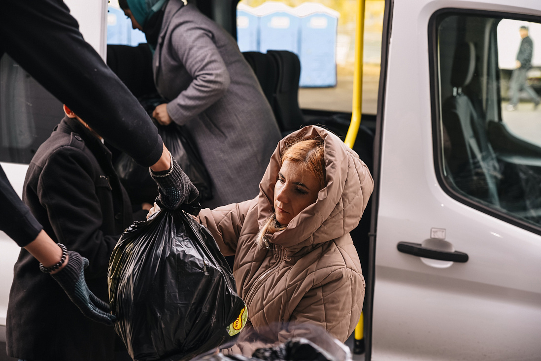 Волонтеры центра гуманитарной помощи формируют комплекты теплой одежды для детей, живущих в ПВР