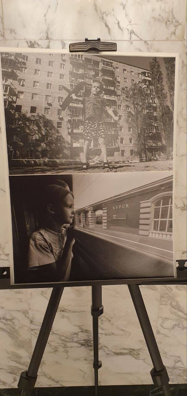 В центре экспозиции две работы фотографа-документалиста, главного редактора журнала «Новые регионы» Сергея Венявского. На первой - девочка из многодетной семьи у окна поезда, покидающего курский перрон, на второй - мальчик Никита, беспечно играющий с самолетиком на фоне многоэтажного дома, поврежденного ракетой. Этот ребенок символизирует твердость и крепость духа жителей Курской области, оптимизм и веру в будущее.
