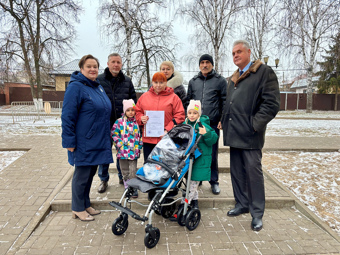 Министр социального обеспечения, материнства и детства Курской области Татьяна Сукновалова вручила инвалидную коляску и сертификат на областной материнский капитал многодетной семье, проживающей в пункте временного размещения в местечке Свобода Золотухинского района.
