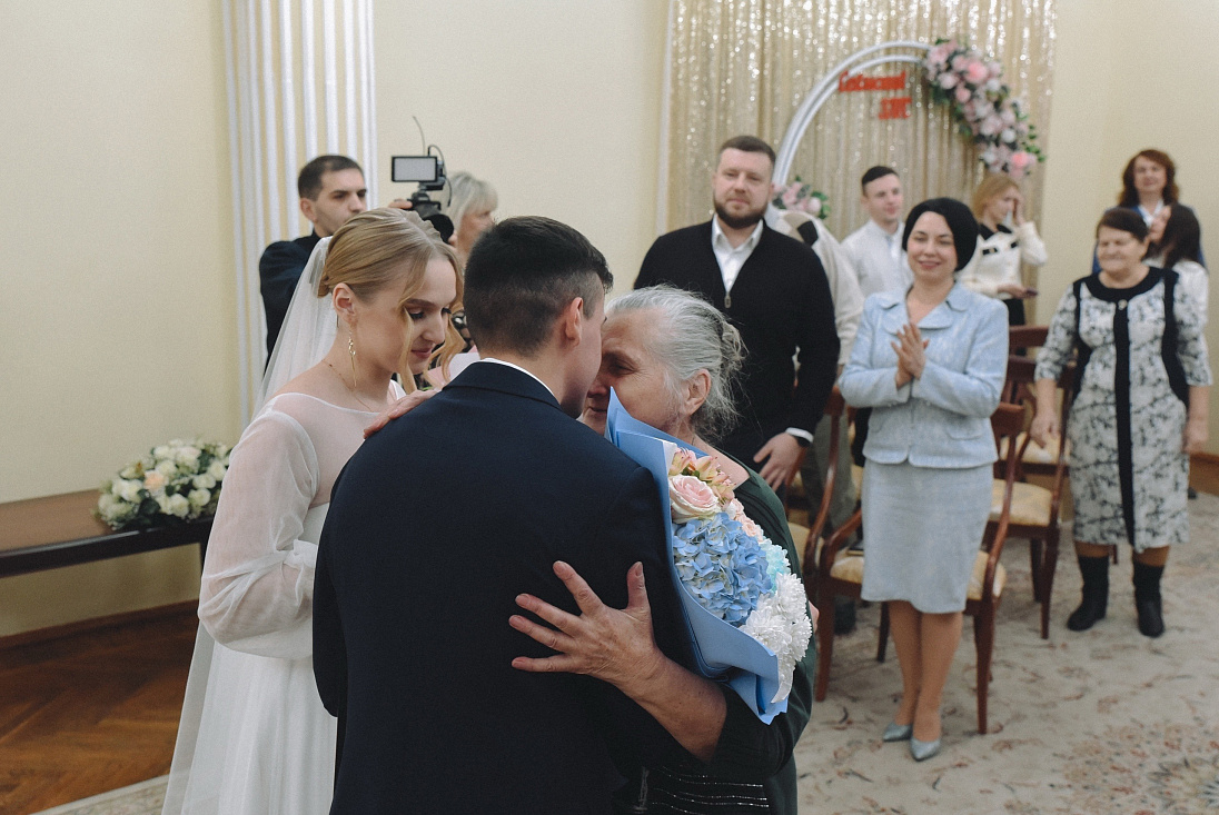 В отделе ЗАГС администрации Сеймского округа Курска состоялась торжественная церемония, на которой был зарегистрирован первый брак 2025 года. Молодые супруги Кирилл и Юлия, как и члены их семей, - вынужденные переселенцы из Суджанского района, жених - курсант военной академии в Воронеже.