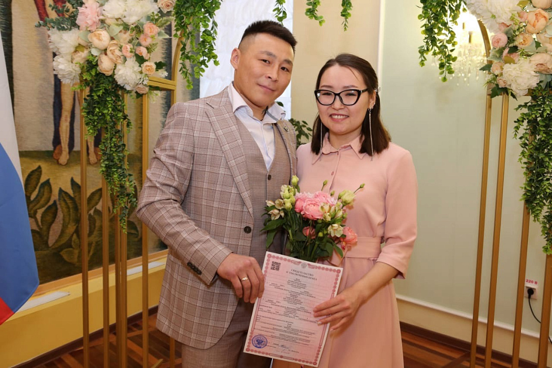 Во время торжественной регистрации заключения брака также чествовали родителей жениха и невесты, которые отпраздновали 22 и 34 года совместной жизни.