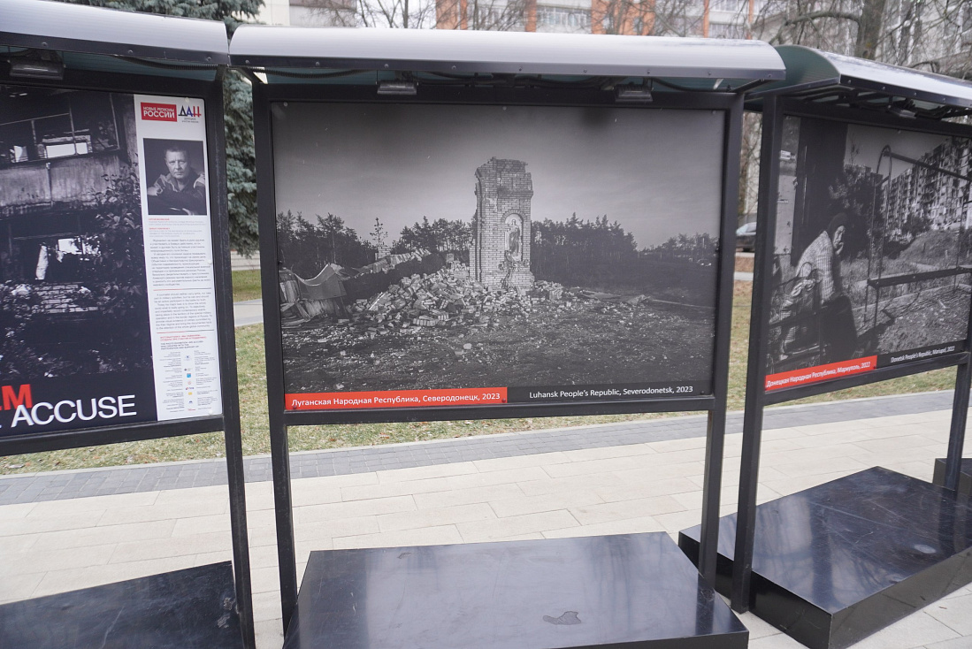 В сквере возле областной библиотеки им. Н.Н. Асеева состоялось официальное открытие уникального международного фотопроекта «Мы обвиняем». В экспозиции 16 стендов с черно-белыми снимками, которые были сделаны в период с мая 2022 года по сентябрь 2024-го на территории ДНР, ЛНР, Запорожской, Херсонской, Ростовской, Курской и Белгородской областей.