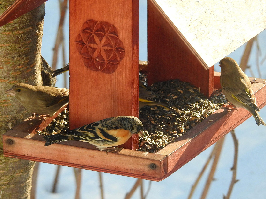 Кроме больших синиц и полевых воробьев, в птичьей столовой можно встретить зеленушек, поползней, дубоносов, дятлов, соек, зябликов, щеглов, чечеток и снегирей, лакомящихся семенами подсолнуха. Некоторые птицы, такие как зарянка и пищуха, прилетают из любопытства. Олеся также замечает, как ястребы-перепелятники патрулируют окрестности в поисках легкой добычи.