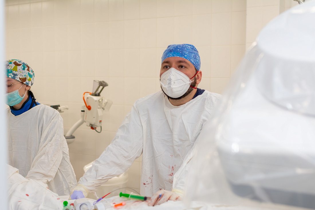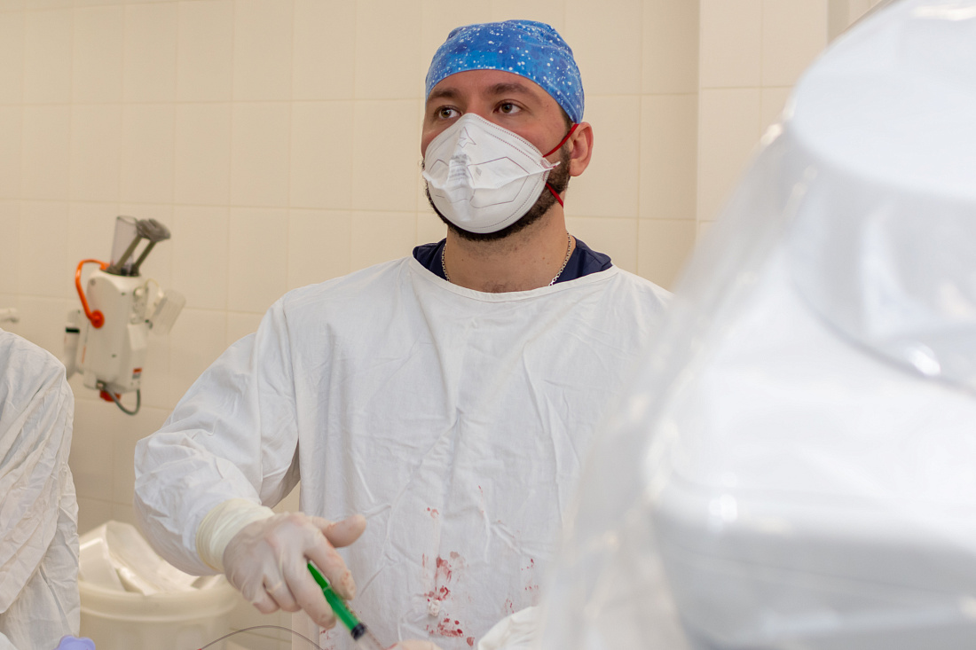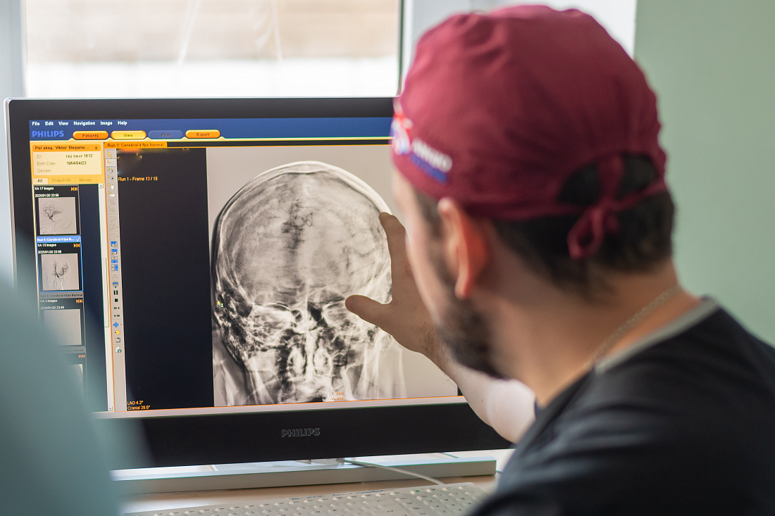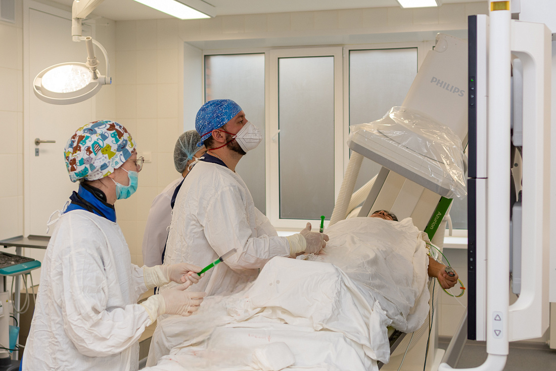 Медики приняли решение применить тромбоэкстракцию, то есть механически удалить тромб из сосуда, чтобы восстановить кровоток. Процедура проводилась в отделении рентгенохирургических методов диагностики и лечения №1 РСЦ в операционной, оснащенной аппаратом для рентгеновского исследования сосудов.