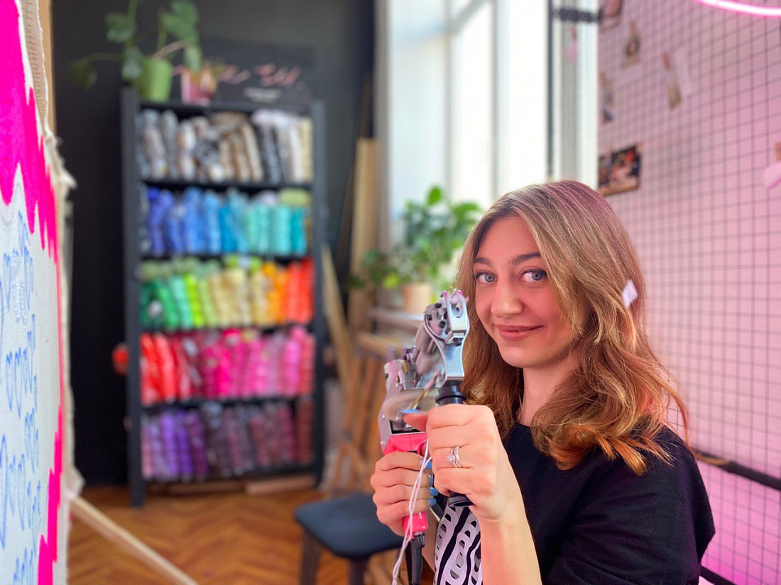 Здесь любой желающий может взять пистолет и попробовать себя в тафтинге - технике, когда рисунок наносится на ткань пучками. А можно освоить ковровую вышивку - петли вбиваются вручную.