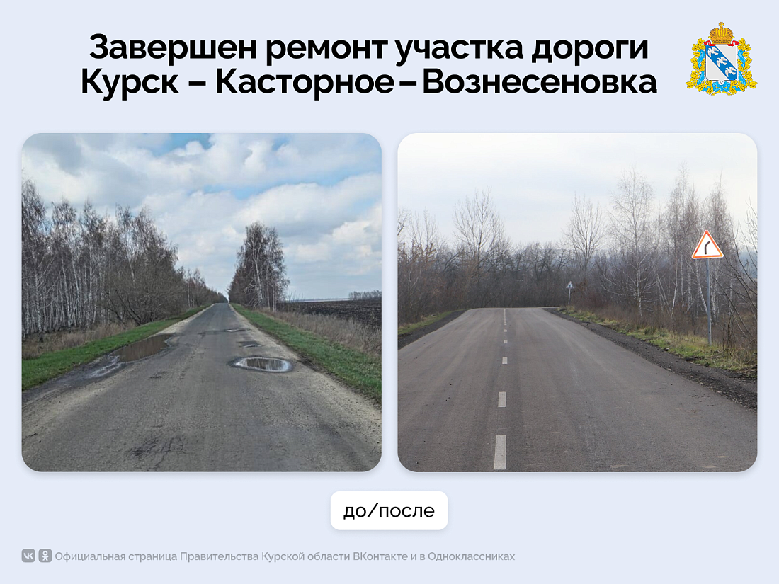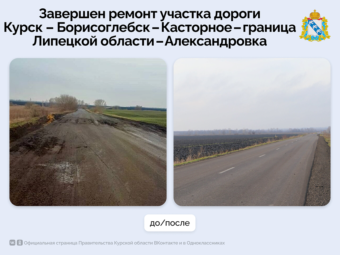Были приведены в порядок 3 км автодороги Курск‑Борисоглебск – Касторное – граница Липецкой области – Погожево, 8,5 км трассы Курск‑Касторное – Вознесеновка и 7 км в направлении Курск‑Борисоглебск – Касторное – граница Липецкой области – Александровка.