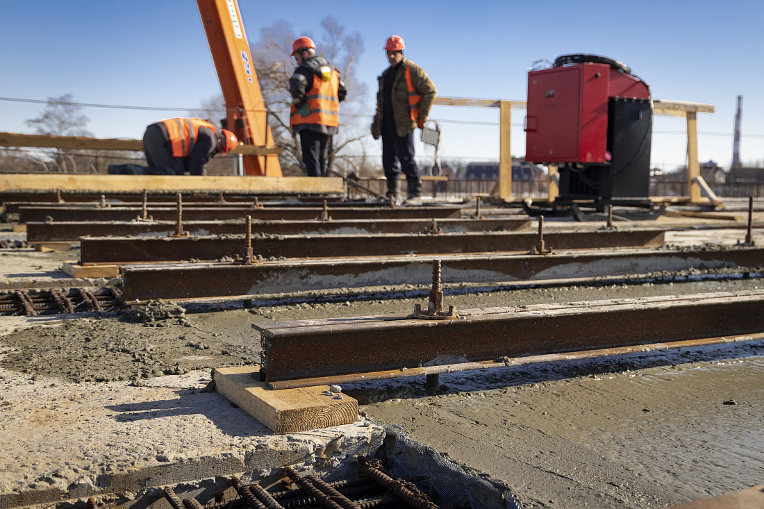 После технологического перерыва продолжен второй этап строительства проспекта Михаила Булатова в Курске. Основные усилия рабочих сосредоточены на возведении мостового сооружения: армировании, устройстве опалубки и монолитных участков, бетонировании межбалочных швов и элементов автодорожного моста.