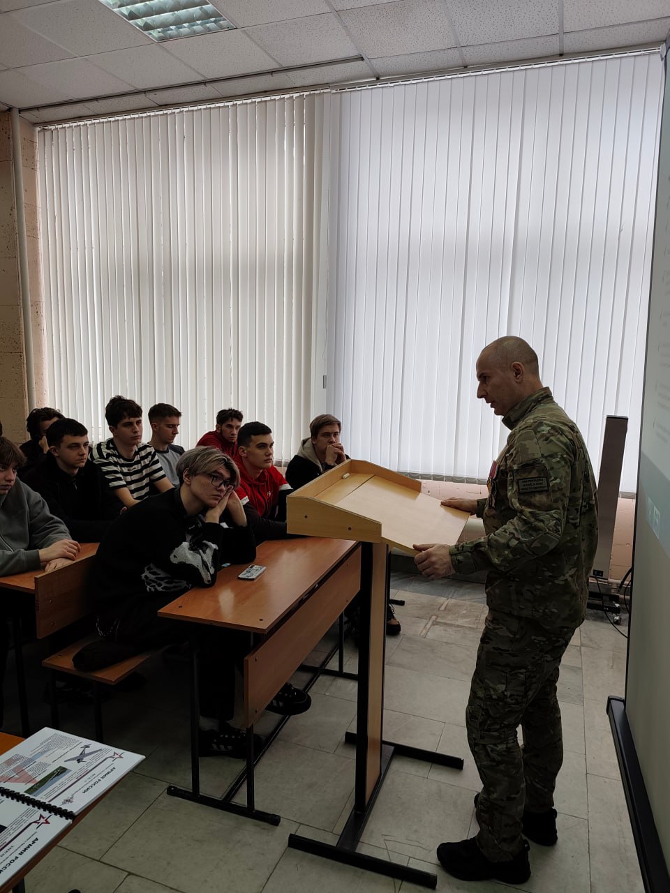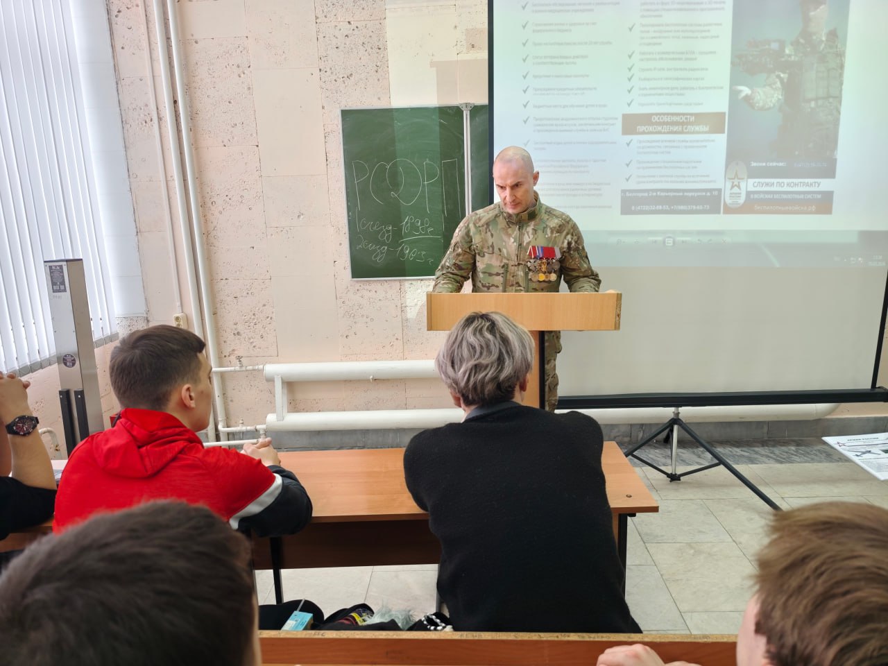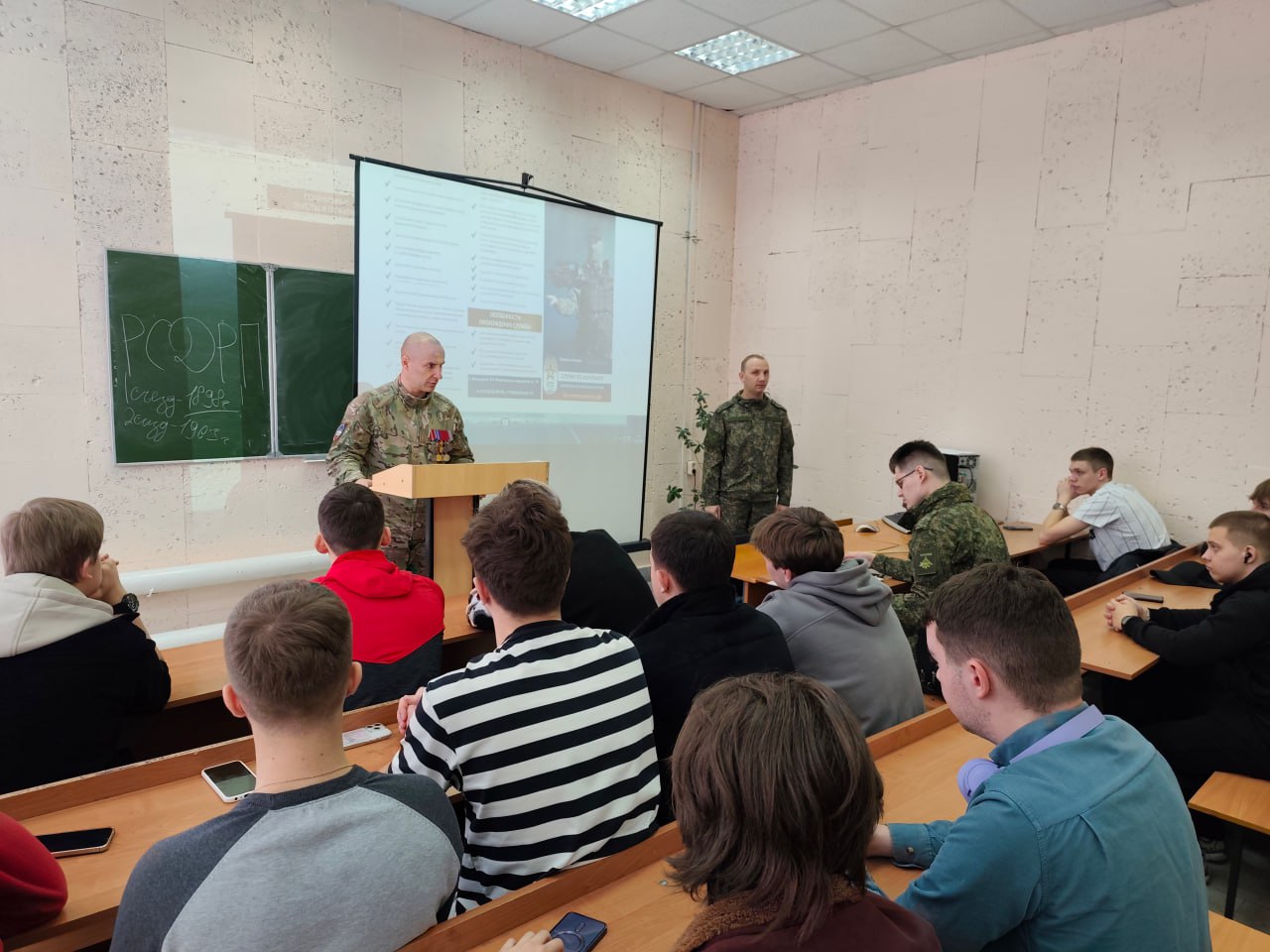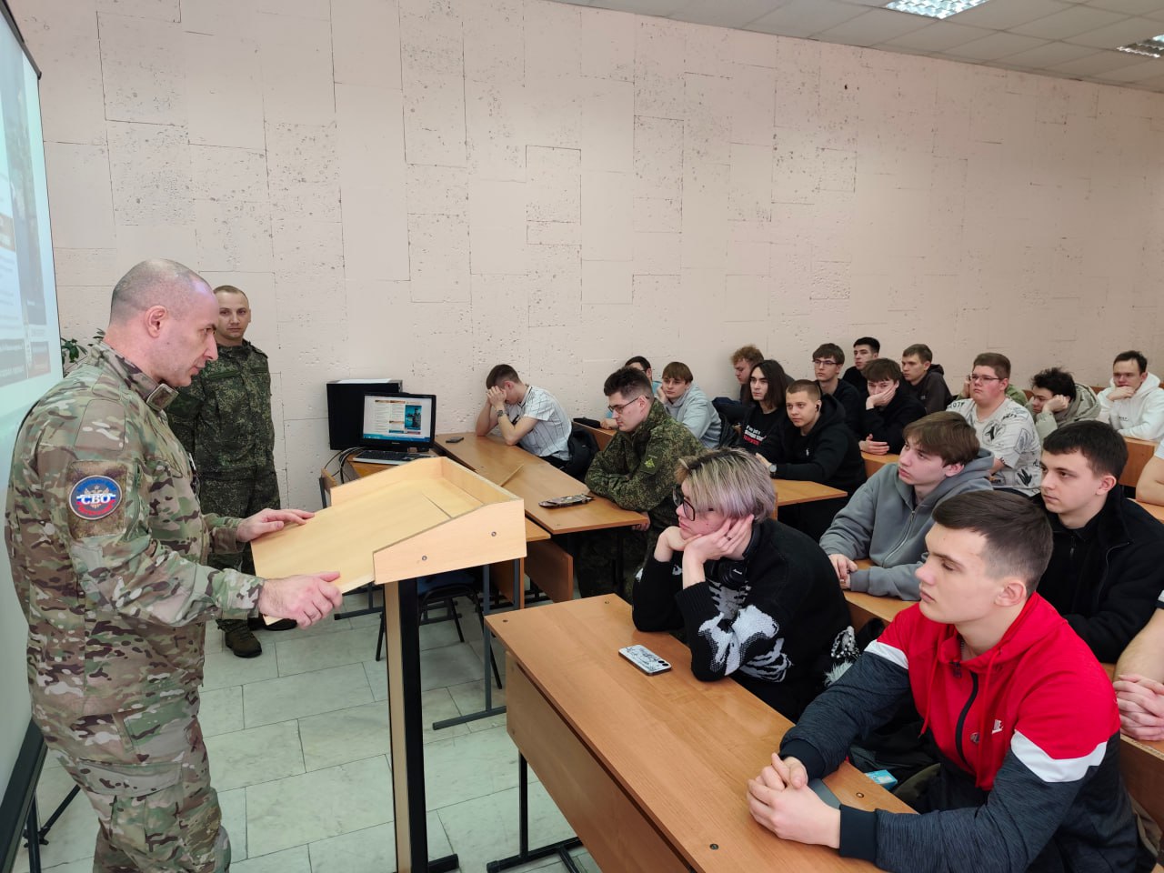 5 марта 2026 г. в рамках проекта «Победили тогда, победим и сейчас!» по инициативе Координационного центра по вопросам формирования у молодежи активной гражданской позиции, предупреждения межнациональных и межконфессиональных конфликтов, противодействия идеологии терроризма и профилактики экстремизма состоялась встреча студентов и преподавателей ФГБОУ ВО «Курский государственный университет» с заместителем председателя Ассоциации ветеранов СВО в Курской области полковником запаса М.А. Калуцких. Участник СВО рассказал о своем боевом пути и участии в специальной военной операции в составе специальных подразделений Минобороны России, ФСБ России, довел информацию о военных преступлениях, террористических актах, совершаемых вооруженными формированиями Украины в отношении гражданского населения, инфраструктуры, в том числе на территории Курской области.