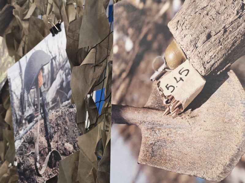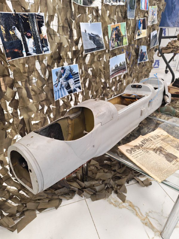 Представитель волонтерской группы «Курский рубеж» Ю. Боевая представила выставку и рассказала о работе своих коллег в курском приграничье за последний год: «Здесь представлены артефакты, обнаруженные во время восстановительных работ волонтерами. Среди них - осколки и обломок беспилотника «Баба Яга», найденный в Рыльске, FPV-дроны, инструменты, которыми волонтеры ежедневно восстанавливают пострадавшие объекты: дрель и шуруповерт. Особую историческую ценность представляет газета «Красная звезда» 1977 года, а также обрывки тетрадей и инструкций, найденные в Льговском районе на месте падения БПЛА. На выставке манекен, одетый в экипировку волонтера «Курского рубежа», и мини-копия памятного знака, разработанного самими волонтерами».