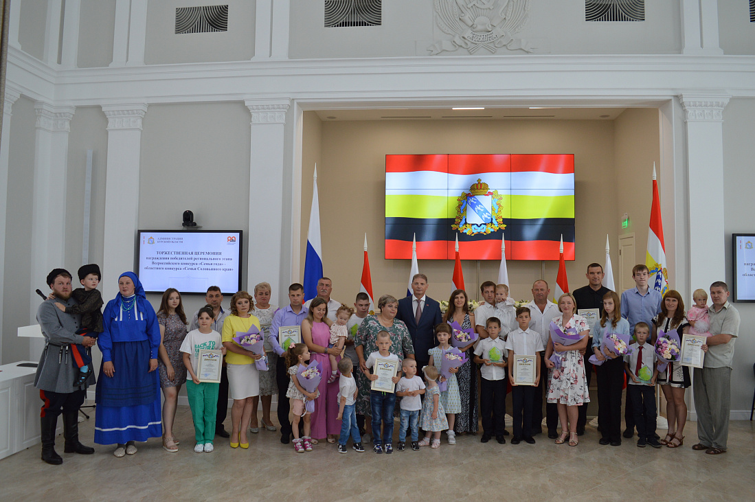 В текущем году участниками конкурса в регионе стала 31 семья, десять из них в соответствии с распоряжением Губернатора Курской области от 29.06.2023 № 110-рг определены победителями регионального этапа в номинациях «Многодетная семья», «Спортивная семья», «Золотая семья», «Молодая семья», «Сельская семья», «Семья-хранитель традиций», «Милосердие». Хочется отметить, что из 10 семей-победителей 8 – многодетные.